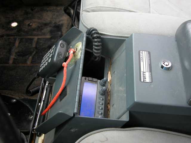 The amateur radio installed is a Kenwood TM-V7 dual band radio. I used the remote mounting kit to allow the control head to be mounted in a Tuffy console and the radio itself to be placed in a Tuffy locking box in the back. A simpler and less expensive way to go for an off road vehicle would be to use a small VHF only radio. Here is a photo of the control head.