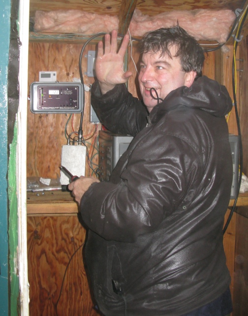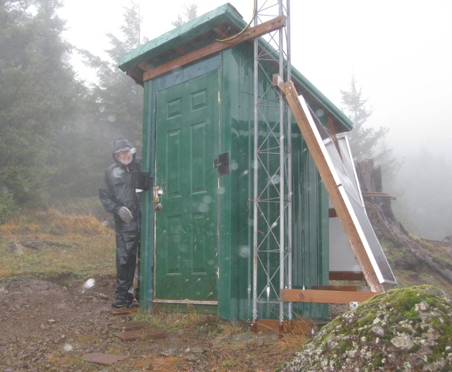 Tim had to hold the door to the repeater shack the entire time that Ken was inside. Ken needed some light so the door could not be closed. Holding that door in place with the strong wind gusts was not an easy task. |