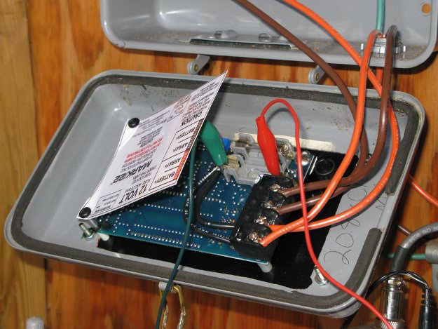 The charge controller has two glass cartridge fuses. On our last trip we found one of them blown but lacked a replacement. Fortunately Ken (WA7PIX) had a 25 AMP blade fuse and some small jumpters so we were able to get the repeater back on the air. After replacing the fuse I left the remainder of the box at the site so we have some spares up there. |