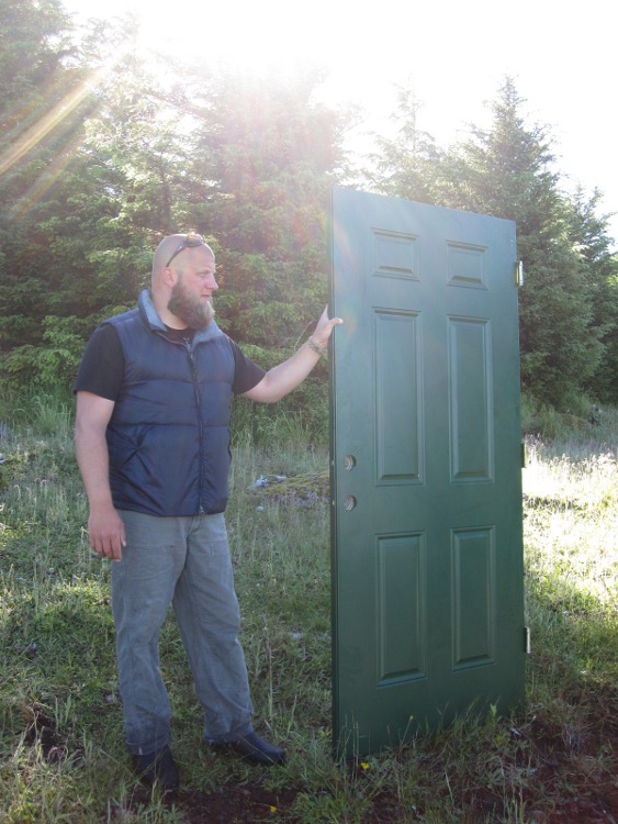 We measured the two doors and determined that they were the same size. The two doors were removed from the frames so that they could be swapped. Brad is holding up the new door. (Note: Amateur photographers often make the mistake of shooting into the sun resulting in a washed out photo. Experienced photographers do this on purpose to achieve an artistic effect.) |
