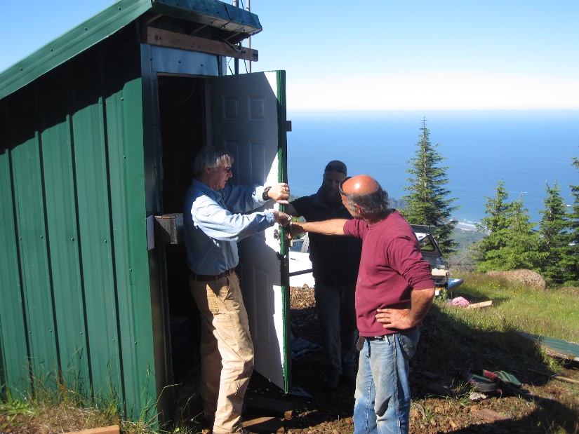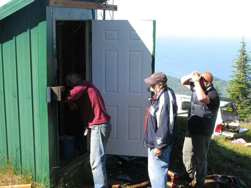 Test fitting the new door. Bob fastens a couple hings while Brad and Tim steady the door. |